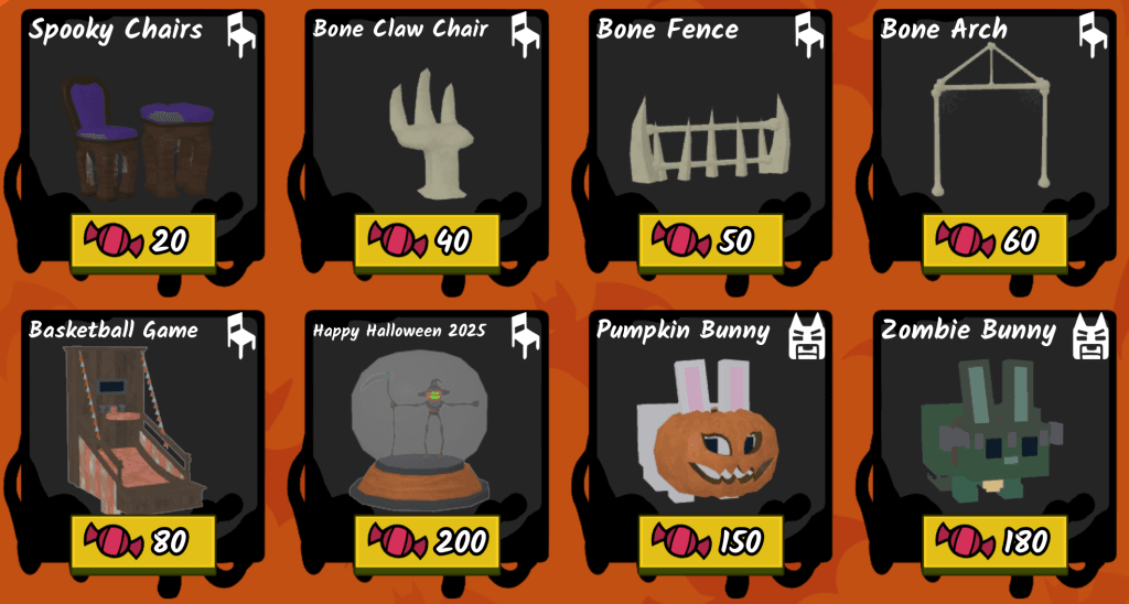 ハロウィンイベント期間中、プレイヤーは「トリック・オア・トリート」や「ポーション作成」を通じてイベント限定通貨「キャンディ (Candy)」を集めることができます。集めたキャンディは、ロビーに出現するNPC「ハッピー・ザ・ハロウィンガイ (Happy the halloween guy)」の「ハロウィンショップ (Halloween Shop)」で、イベント限定のクラスやアイテムと交換できます。